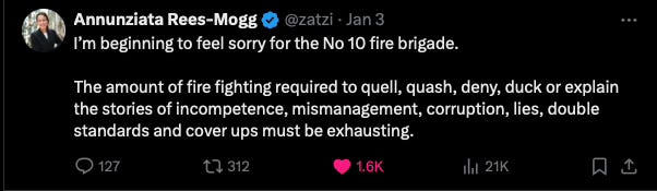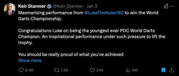 Starmer has just returned from what he feels to be a well-deserved holiday. The degree of his awareness as to what is going on in the political world which he inhabits (but does not seem to understand) is encapsulated in this, from the 3rd January - a real finger-on-the-pulse-of-the-nation tweet - just as savage criticism from the United States, as well as his own country, was approaching a zenith: