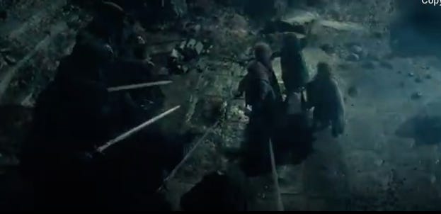 In the first book of Lord of the Rings, The Fellowship of the Ring, the four Hobbits, Frodo, Samwise Gamgee, Merry and Pippin, along with their guide and protector Aragorn, are pursued by the Nazgul whose number grows as the story progresses. The Hobbits know that they are pursued and know that their pursuers are evil and are intent upon seizing the Ring of Power from Frodo. Pursuers and pursued meet at Weathertop and the Nazgul surround the Hobbits. The Nazgul are temporarily defeated by Aragorn in a ferocious fight, but not before Frodo is stabbed by the Nazgul. His survival is in the balance and the outcome is uncertain.